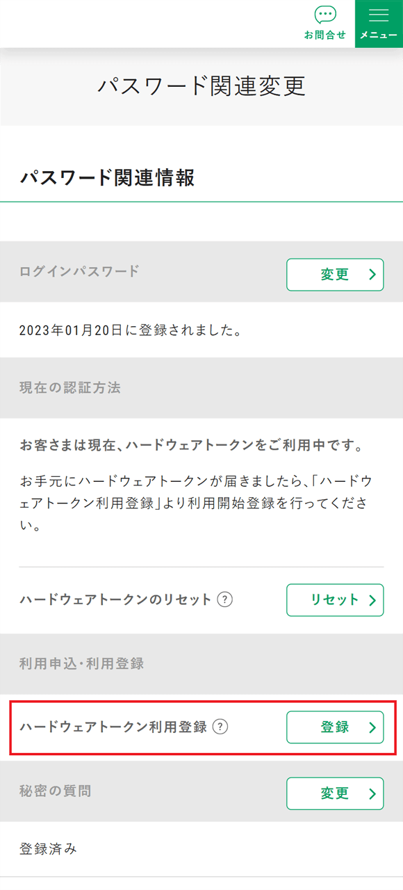 ①マイゲートへログインし、『その他サービス』→『パスワード関連変更』→『スマホ認証・ハードウェアトークン等』→『ハードウェアトークン利用登録』の順に選択。