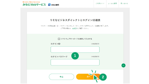 みなとビジネスダイレクト、みなとWebサービスのログインID・パスワードをご用意ください。
