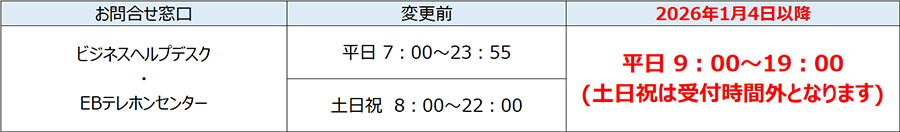 ビジネスヘルプデスク・EBテレホンセンターに関するお問合せ先の受付時間変更のお知らせ