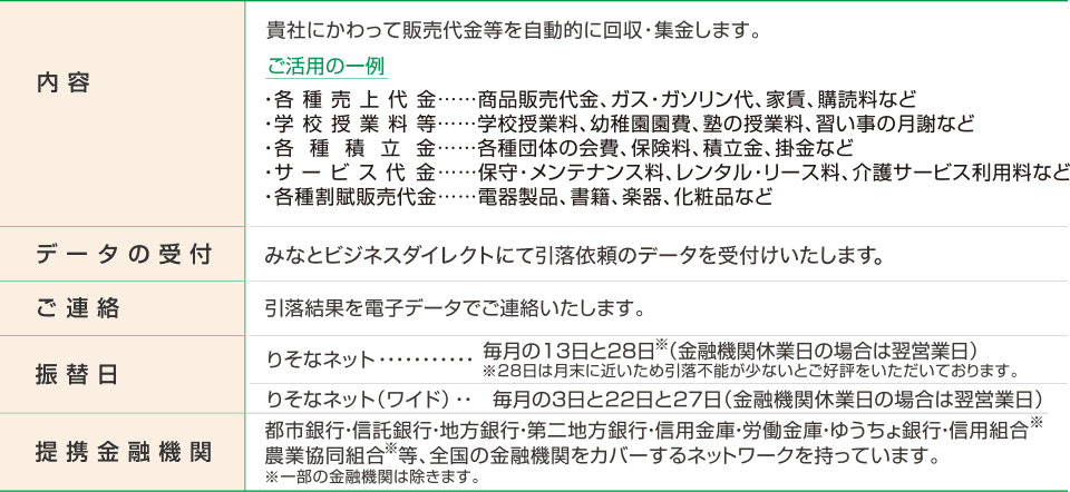・「りそなネット」「りそなネット(ワイド)」は、全国に広がる提携金融機関のネットワークを通じ、貴社に代わってご集金先の取引金融機関から、口座振替で引落し、まとめて貴社のご指定口座にお振込みするサービスです。
