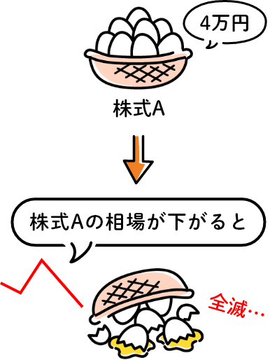 「株式A」というひとつのカゴに卵を全部入れた場合、もし落としてしまったときに大惨事ですよね。でも複数のカゴに分けておけば、ひとつ落としても他の卵は無事、というわけです。