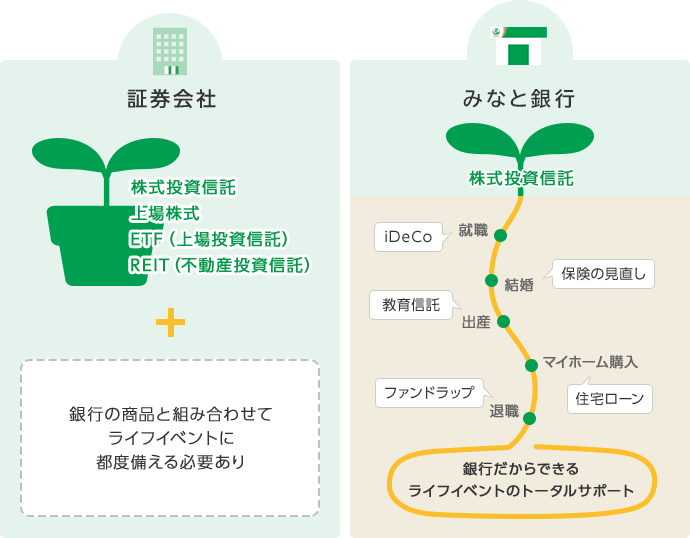 みなと銀行では、投資信託の相談だけでなく、結婚・出産にともなう保険の加入・見直し、マイホームの購入、退職後の資金運用など、お客さまのライフイベントに合わせた総合的なご提案が可能になります。