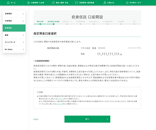 02「口座開設はこちら」→ご確認事項を確認後「上記内容を確認し、同意して次へ」をクリックして、振替相手となる普通預金口座を選択して「次へ」をクリックします。